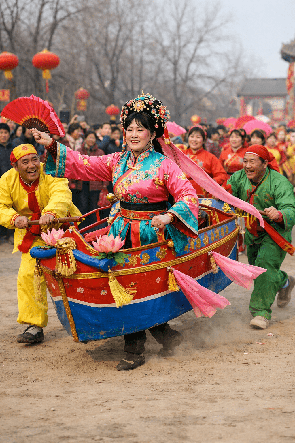 In the days following New Year’s Day, many communities hold festive parades featuring lion dancers, stilt walkers, and traditional land boat dancers. The Land Boat dance is a traditional Chinese folk dance that originated in northern China. The main performer wears a lightweight, decorative “boat” frame around the waist, creating the illusion that they are standing or moving inside a small boat. This kind of dance expresses a wish for prosperity, peace, and happiness.