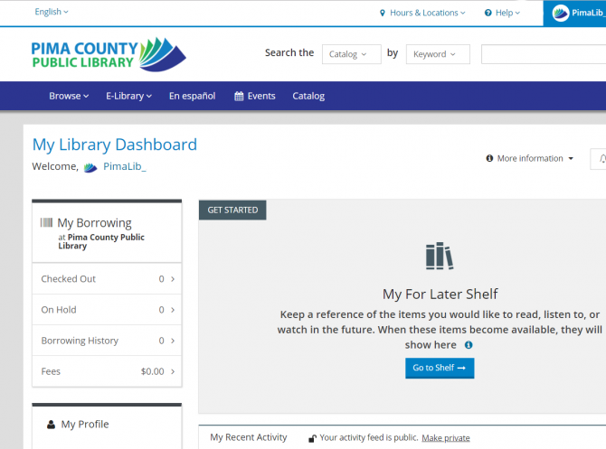 Click My Account to see a menu of options for your account. Here is how you can view your borrowing information. Click the links under My Borrowing (Checked Out, On Hold, Borrowing History) to view those items.